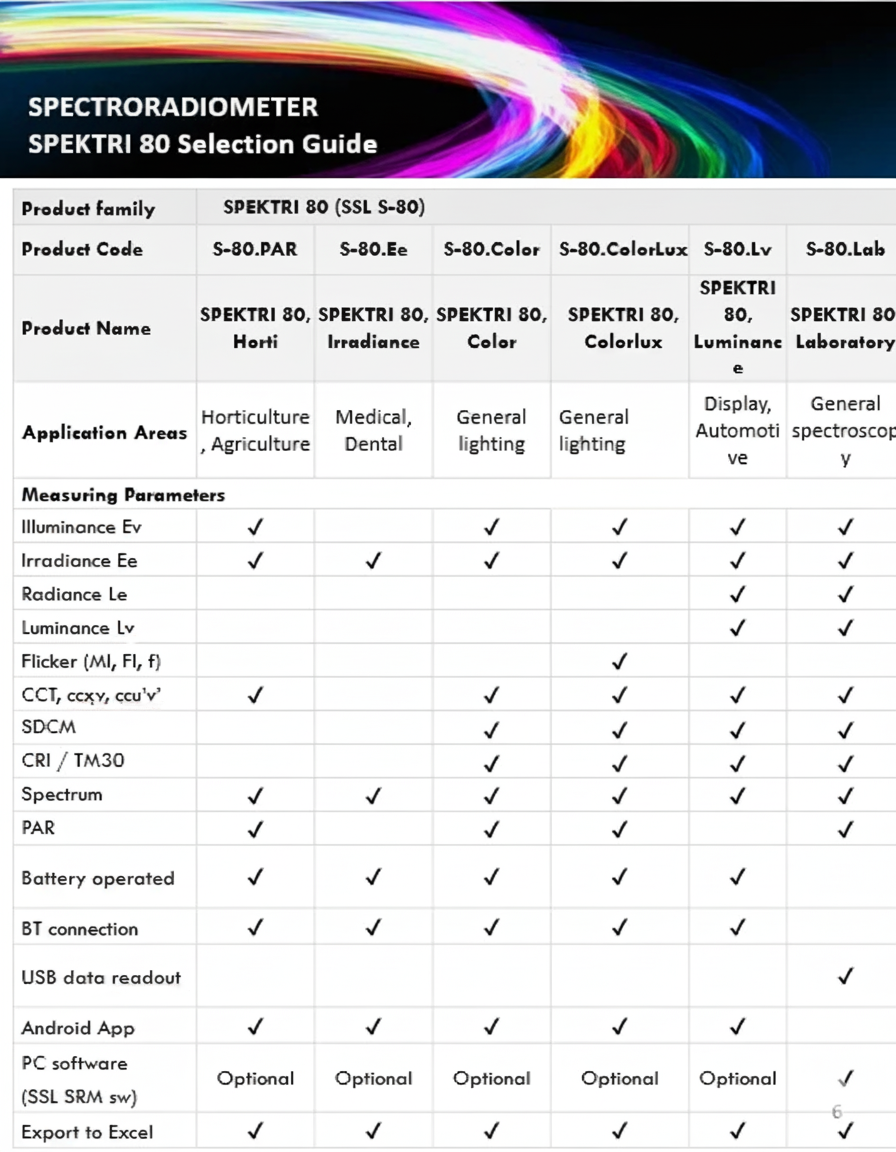 • Fotometria ja colorimetria: valaistusvoimakkuus lx, värilämpötila CCT, värikoordinaatit